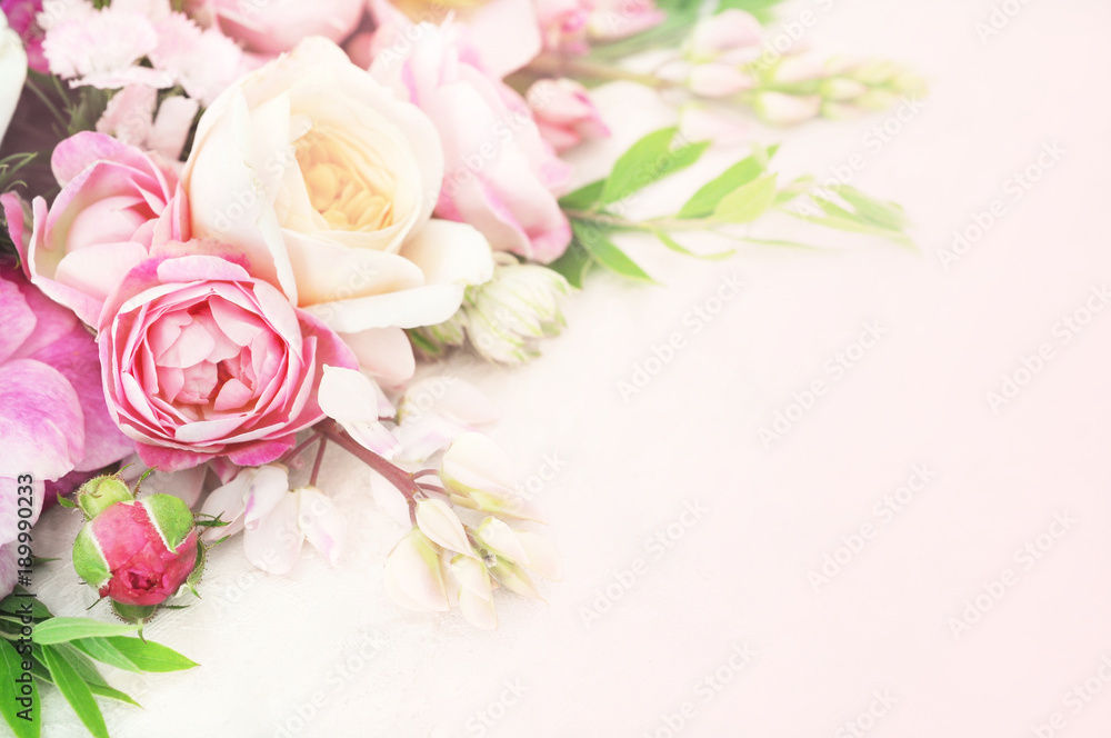 Summer blossoming delicate rose on blooming flowers festive background, pastel and soft bouquet floral card