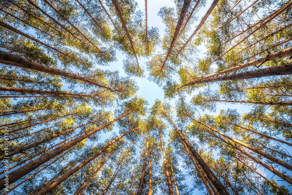 The trees pine on sky background in summer sunny day. Green pine forest background.
