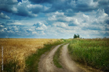 Summer country road and fields on the background of the blue beautiful cloudy sky.
