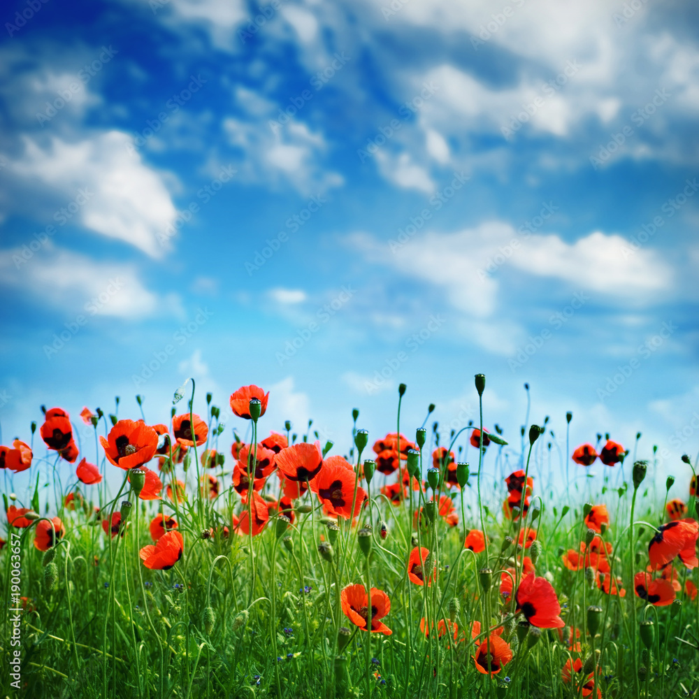 Blooming Poppies over blue sky and cloud. Poppy flowers field nature spring background. Rural landscape with red wildflowers.
