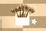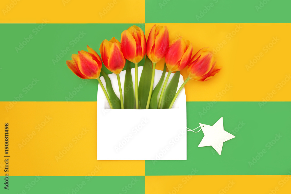 Red yellow tulip flower springtime gift, white envelope with gift tag. Birthday, Mothers Day, Easter card abstract design. On green yellow geometric background.