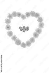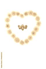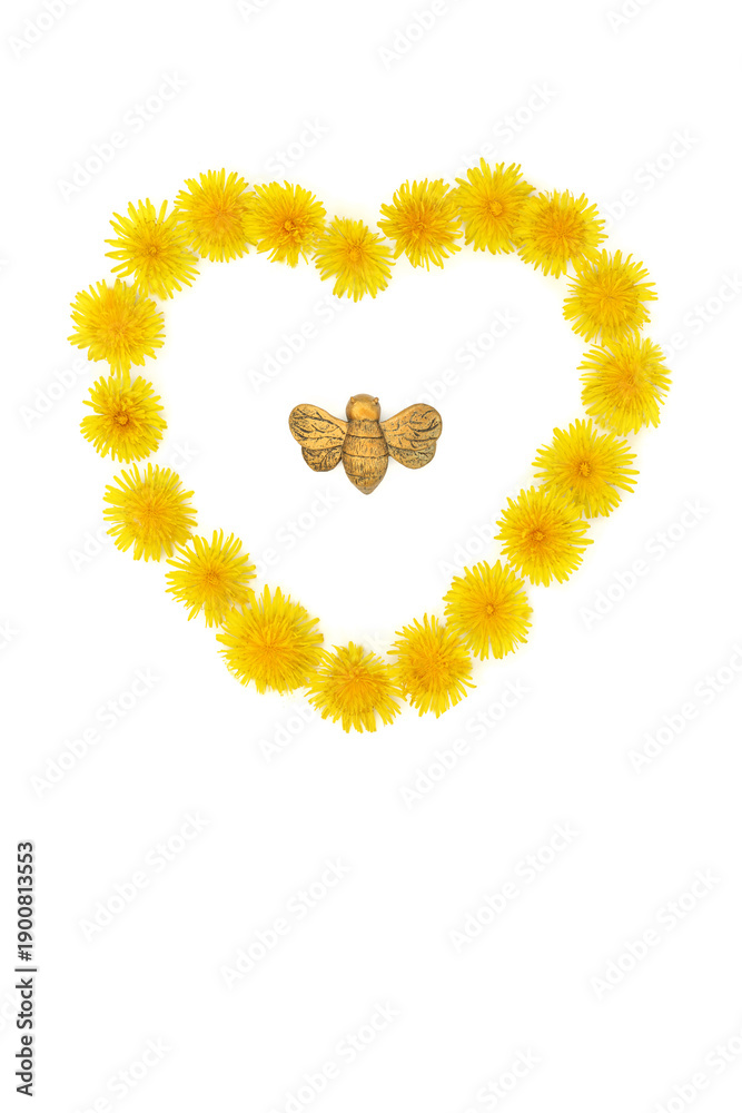 Dandelion flower heart shape wreath for bee nectar on white with gold bumblebee ornament. Flora for promoting flowers for bees. Environmental conservation concept.