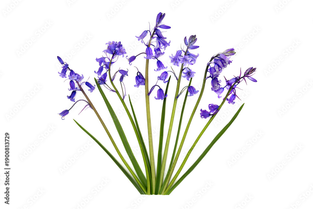 Spring bluebell beautiful wildflower arrangement on white background. Woodland and meadow flowers of Springtime season. Design for logo or greeting card.