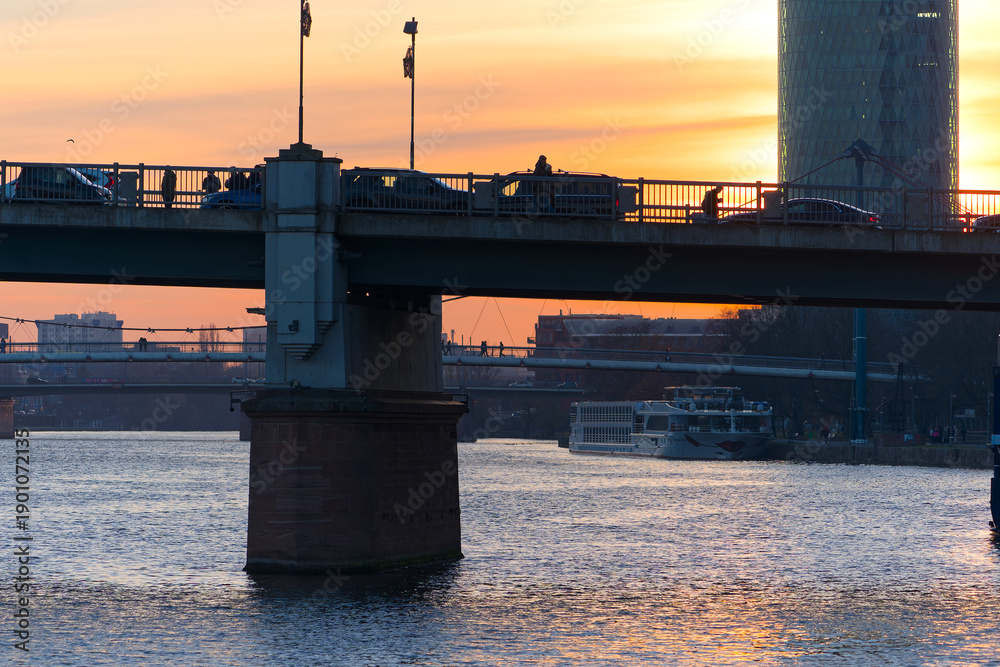 Beautiful sunset with Untermainbrücke bridge in the foreground and skyscraper in the background on an autumn sunset. Photo taken November 22nd, 2026, Frankfurt am Main, Germany.