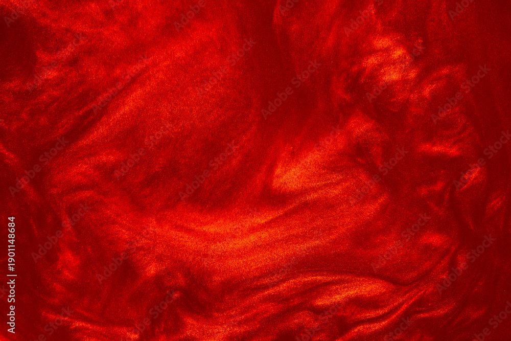 Shimmering red abstract background. Liquid glitter paint texture waves and swirls. Beautiful shiny red glitter texture. Metallic paint close-up as a holiday background.