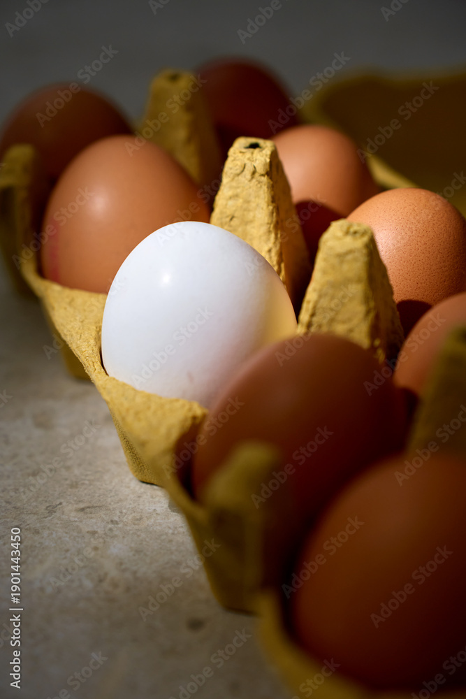Close up of one white egg among brown chicken eggs in a recycled cardboard carton
