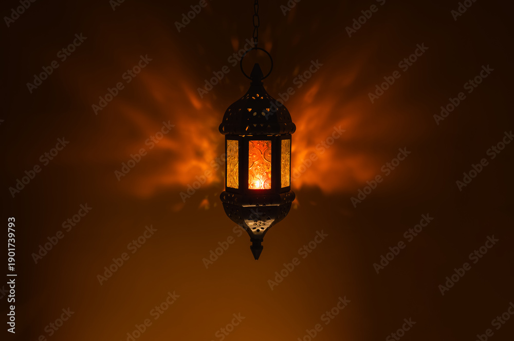 A glowing lantern radiates warm light for the holy month of Ramadan Kareem.