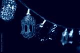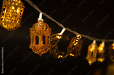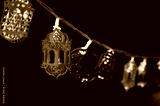 Festive golden lantern and crescent moon string lights glow against a dark background.
