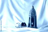 A tall golden lantern with colorful glass stands beside dates on a white silk background.