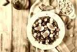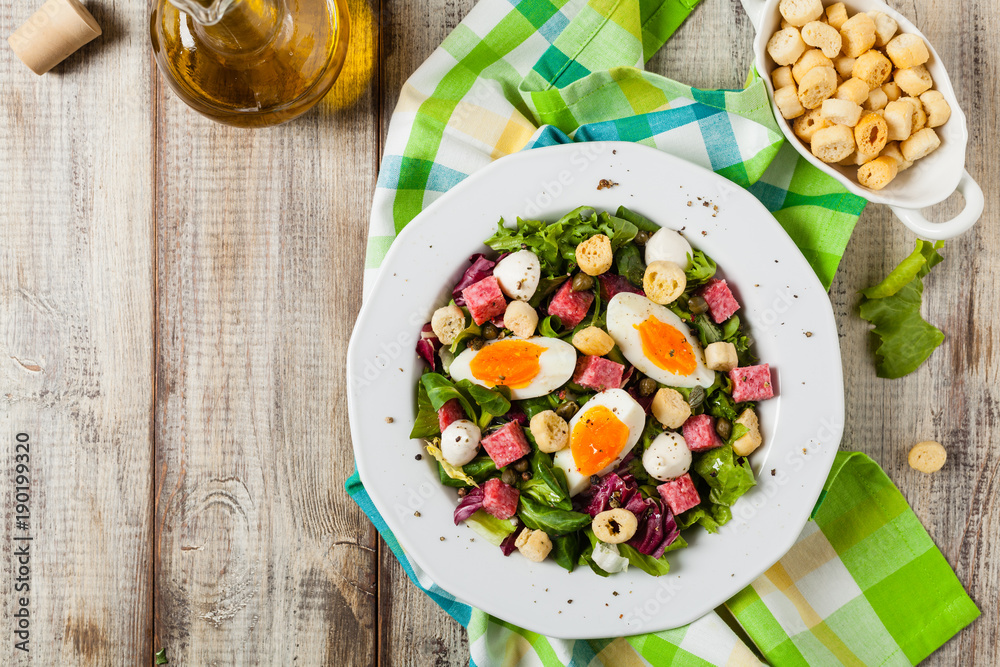 Delicious Italian salad with salami, egg, crostini and mozzarella.