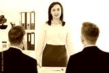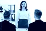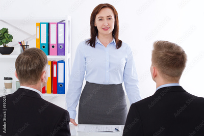 Serious Woman is a boss. Business meeting at office background. Team work Businessman and businesswoman. Selective focus and copy space