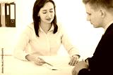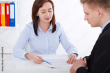 Business partners discussing documents and strategic planing at meeting. Office background. Businesswoman and Businessman. Selective focus and copy space