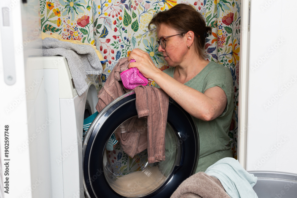 Woman stands in bathroom putting clothes into washing machine while surrounded by towels and laundry, carrying out daily household task with focus and care