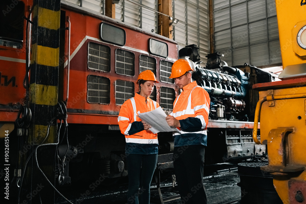 Engineers planning team work in industrial factory, professional engineering teamwork with blueprints, safety helmets, collaboration in manufacturing industry, industrial workplace environment