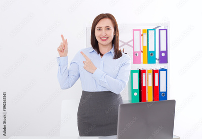 Happy and successful businesswoman raising her arms at office background and showing something isolated on white. mock up and copy space. Business success concept. Mother at work