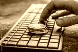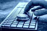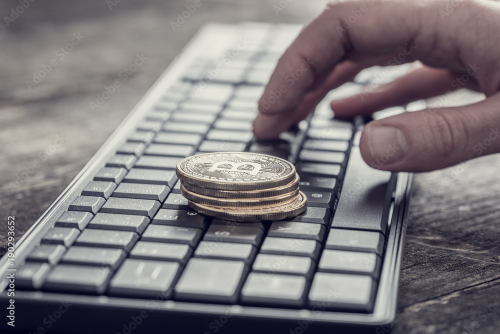 Golden Bitcoin coin over black computer keyboard and male fingers typing