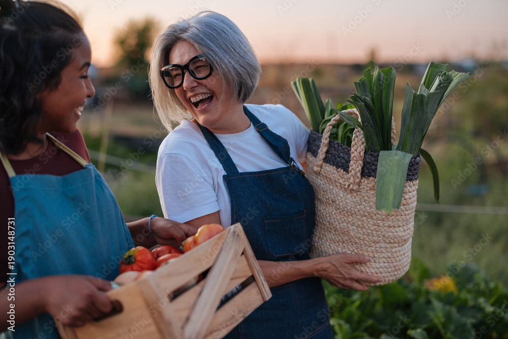 Two women in a sunny garden share a laugh while transporting fresh produce and baskets of vegetables