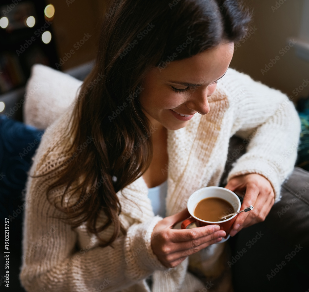 Smile, relax and coffee with woman on sofa in home for winter beverage, weekend break and health. Caffeine drink, happiness and peace with female person and mug in living room of apartment for tea