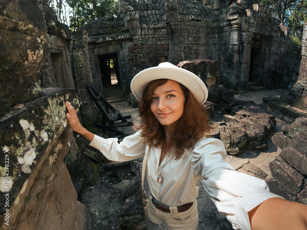 Happy Tourist Woman Snapping Selfie at Ta Som Temple in Angkor Wat Ruins