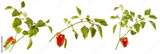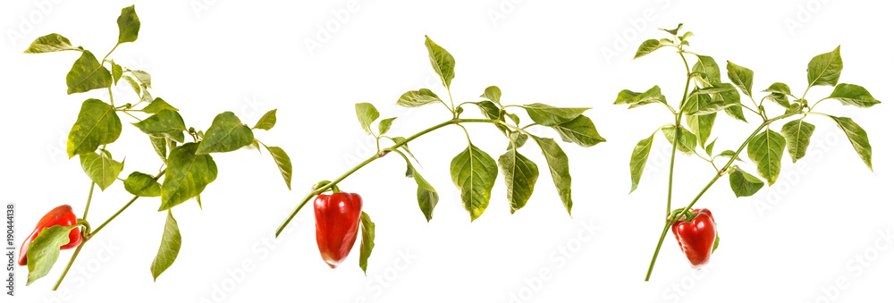 Sweet red pepper with a stem and green leaves on a white isolated background. Space for text. Background. set, collection.