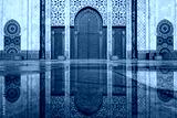 view of Hassan II mosque's big gate reflected on rain water - Casablanca - Morocco