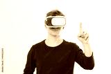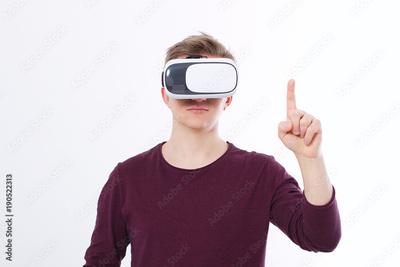 Young Man wearing virtual reality goggles and toch space by finger isolated on white background. VR concept and copy space. Selective focus. Blank template Shirt.