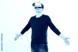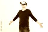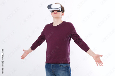 Young man wearing virtual reality goggles isolated on white background. Digital VR glasses for 360 game. Template and blank shirt. Copy space and mock up