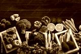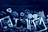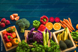 Top view of fresh vegetables on table, Fresh vegetables in wooden container with copy space