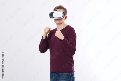 Young an wearing virtual reality goggles isolated on white background. VR glasses technology headset and boxing game. Copy space and mock up