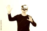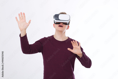 Excited young man in a VR headset, glasses. Virtual reality isolated on white background. Copy space and mock up