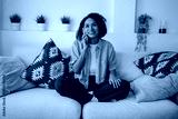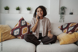 Woman Talking Happily, Woman Relaxing And Chatting, Woman Lounges On Couch During Cheerful Call