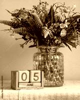 Wildflowers bouquet with purple lupine and yellow buttercups in a glass vase, standing next to a block calendar displaying June 5, symbolizing nature, summer, and the World Environment Day