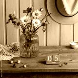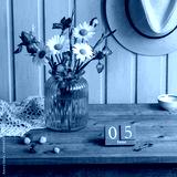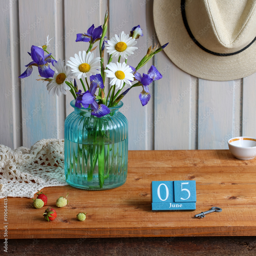 Rustic wooden table with turquoise vase of irises and daisies, vintage June 5 calendar, ripe and unripe strawberries, old key and straw hat for cozy country charm