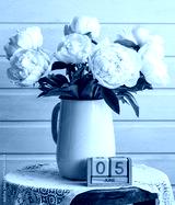 Pink peony flowers in a blue pitcher sit on a wooden stool with a lace tablecloth next to a wooden block calendar showing June 5th, creating a serene floral still life