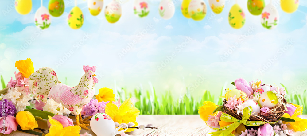 Cheerful Easter setting with decorated eggs, spring flowers, and green grass under a blue sky, ideal for festive banners, holiday promotions, and seasonal backgrounds.
