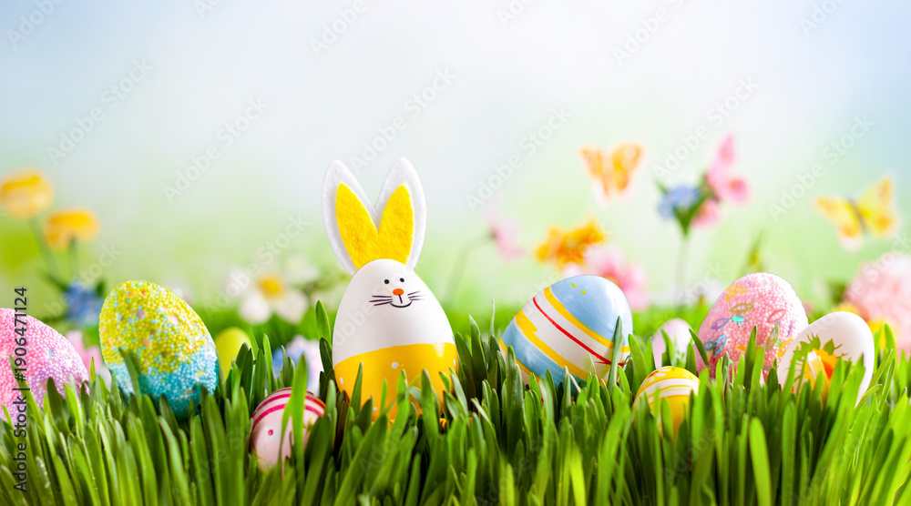Cheerful Easter scene featuring painted eggs and a cute bunny decoration hidden in fresh green grass, perfect for holiday greetings, children's designs, and spring celebrations.