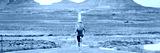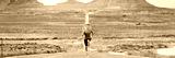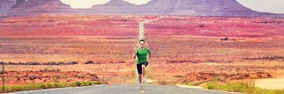 Runner man running sprinting on road of mountain nature. Male sprinter training for success. Fit sports athlete working out in amazing desert landscape. Panorama banner with copy space on background.