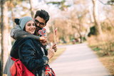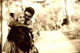 A happy guy and a girl hold a lollipop in their hands.