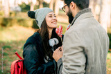 A happy guy and a girl hold a lollipop in their hands.
