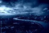 Elevated view of the cityscape of London, UK, with dramatic cloudscape, sunshine and rainfall during sunset time