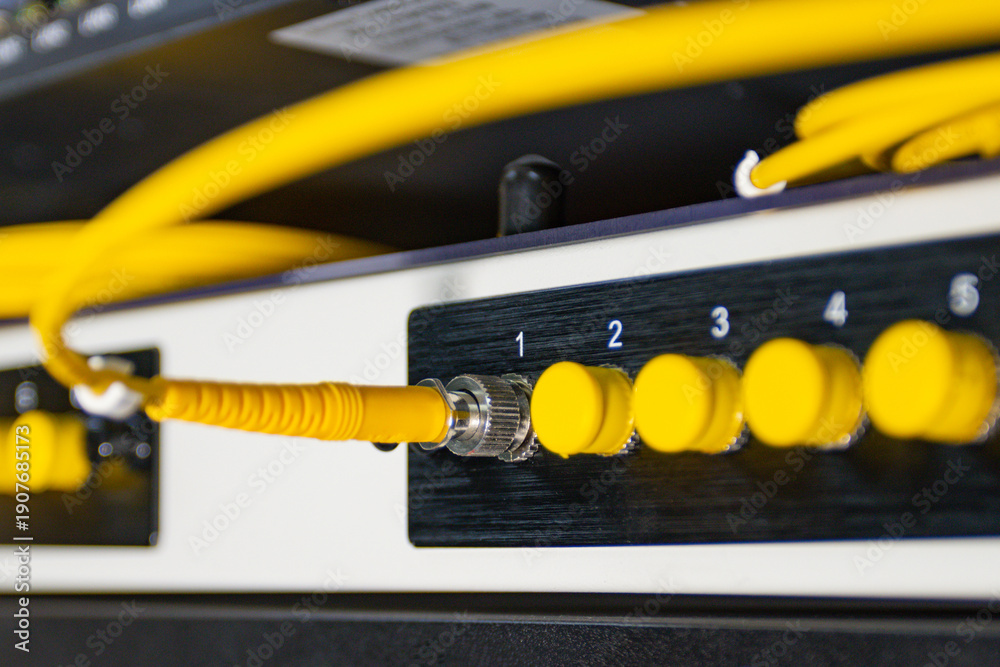 Close up of network switch with yellow ethernet cables connected, server room equipment