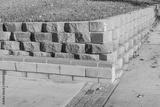 Residential retaining wall featuring a variety of stacked blocks and mortared brick textures, horizontal aspect