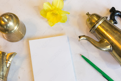 cutlery, amusement, vintage style concept. top view of old bronze tableware for tea ceremony and white clean album with pen for drawing, it is negative space for text