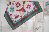 interior, background, handmade concept. there is adorable and cosy blanket crafted of different clothes, it has coloures and interesting abstract geometric figures