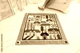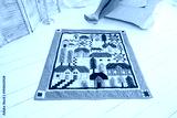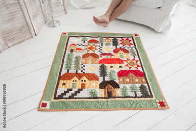 handmade, comfort, interior design concept. on the white wooden floor there is lovely and cosy blanket, it has adorable applique of different houses and trees