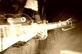 performance, creativity, rock style concept. close up of guitar in the arms of caucasian male musician, that figure is getting lost and blurred on the dark background