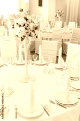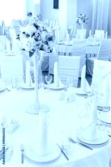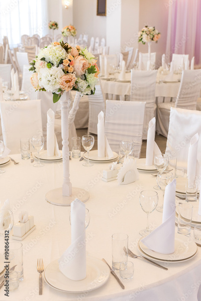 floral arrangement, interior, celebration concept. there is adorable table of restaurant served with white plates and tall and elegant glasses, in the center of table there is a bouquet of flowers