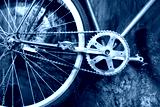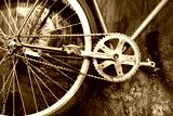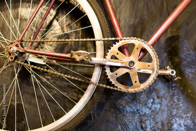 lifestyle, leisure time, engineering concept. close up of chain on the wonderful classical bicycle that hung on the black painted wall, it has clean wheel and straight spokes
