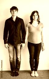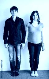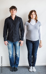 lifestyle, fashion, beauty concept. on the white background of wall there is a man and a woman who are holding by hands and drawing to their full height
