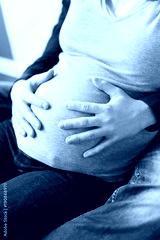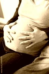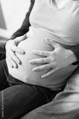 love, expectation, birth giving concept. close up of male arms on the belly of his pregnant wife dressed in grey sweater and tight jeans, they are sitting embracing each other